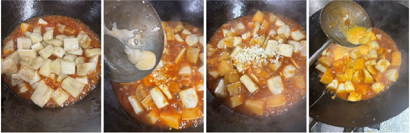 ④③へ油通ししたラテを入れて軽く煮合わせ、水溶き片栗粉でとろみを付けたら、溶き卵を加えてゆっくり混ぜながら全体にしっかり火を入れる。最後にゴマ油を混ぜて完成。