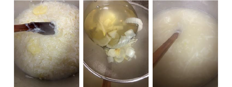 ②鍋に水を張り、①の玉ネギとジャガイモの皮を入れて弱火で30 分ほど煮出す。
