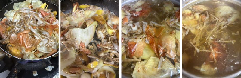 ②①の野菜の皮と芯をフライパンで乾煎りしたら鍋に入れ、水を張って弱火で30~40分ほど煮出す。