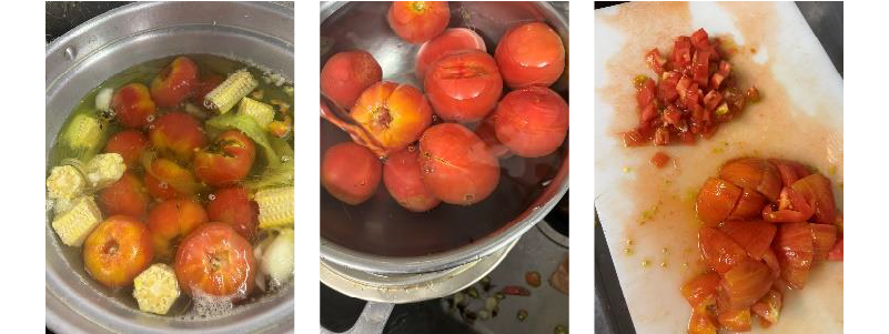 更にダシにトマトを入れ、皮がむけて来たら冷水に入れて湯むきをする。むいたトマトは1個を1㎝角にカット、2個を1/4のザク切にする。