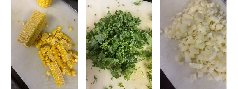 ①トウモロコシはヒゲ、果肉、芯に分け、玉ねぎとケールは1㎝角にカットする。トマトはヘタを取る。