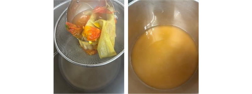 ダシとトマトをミキサーで回して灰汁を取り、下味を決める