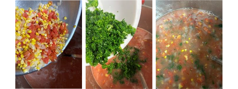 ⑤④に③の冷やしたトウモロコシと玉ネギ、トマト、ケールを加えて、味を調整し、最後にレモン汁を加えて完成。