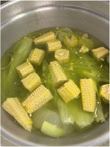 取っているダシでトウモロコシ、玉ネギ、ケールを茹でて冷やす
