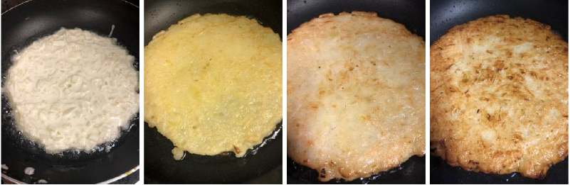 フライパンに油と生地を入れて丸く伸ばして弱火で焼き、軽く色が付いたら返して、を数回繰り返しながら両面に焼色を付ける。
