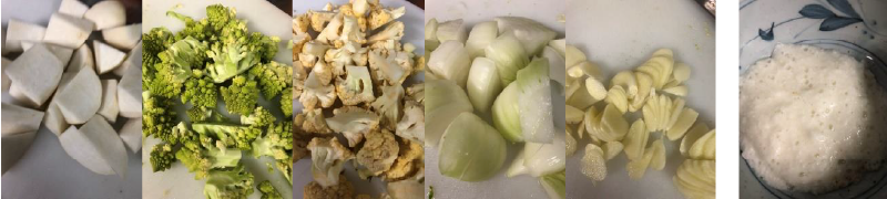 ①かぶは皮をむいて1/8にカット、ロマネスコ、カリフラワーは一口大に切り分け、玉ネギは3㎝角にカット、にんにくは2㎜厚にスライスする。長芋は皮をむいてすりおろしておく。