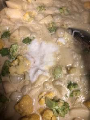 ④③に水と生クリームを入れ、野菜に程よい歯ごたえが残るくらいまで煮込む。