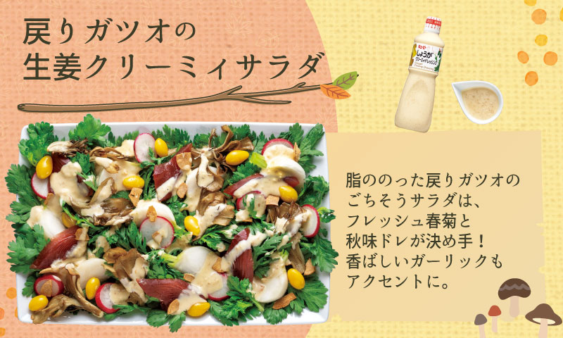 春菊を敷いた器に具材〔生ガツオ、小かぶ(塩もみ)、ラディッシュ、舞茸(素揚げ)〕を盛り合わせ、ぎんなん(水煮・素揚げ)とほしえぬ フライドガーリックをトッピングし、QP しょうがクリーミィドレッシングを別添し、かける。