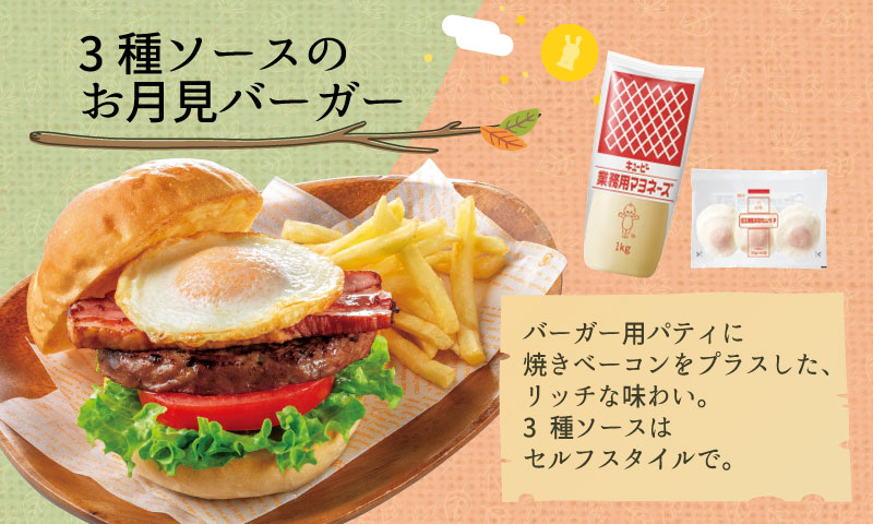 バーガー用バンズ(トースト)にQP 業務用マヨネーズを塗り、具材〔グリーンリーフ、トマト、バーガー用パティ&ベーコン(焼き)、SM 目玉焼風まるオムレツP(揚げ)〕を順にサンドして器に盛り、フライドポテトを添え、3 種のソース〔QP タルタルソース 具沢山、QP 具沢山フィリング アボカド(ワカモレ)、QP 具沢山フィリング トマトとたまねぎ〕