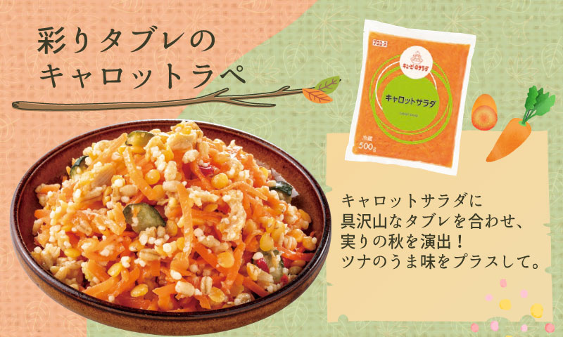 QP のサラダ キャロットサラダにSM レンズ豆ともち麦のタブレとツナ(缶)を合わせ、