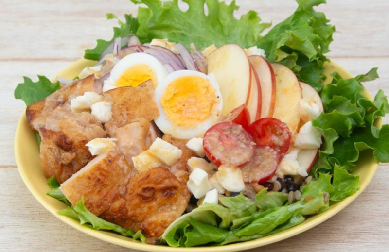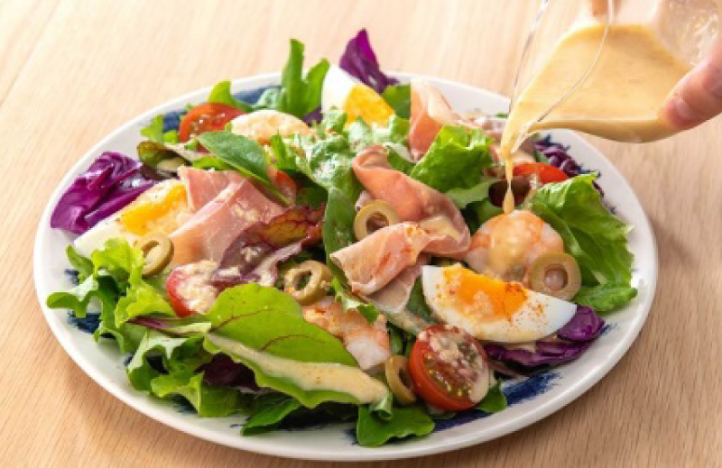 グリルしたきのこやベーコンと水菜のサラダです。チルドドレッシングをかけて、アクセントにピンクペッパーをトッピングしました。