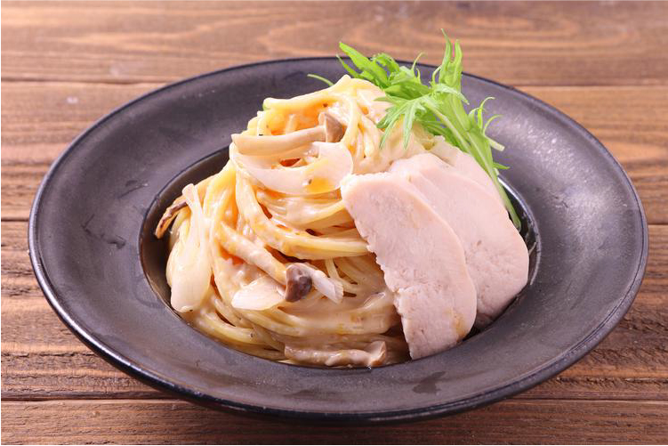 柚子胡椒香る蒸し鶏ときのこのクリームパスタ
