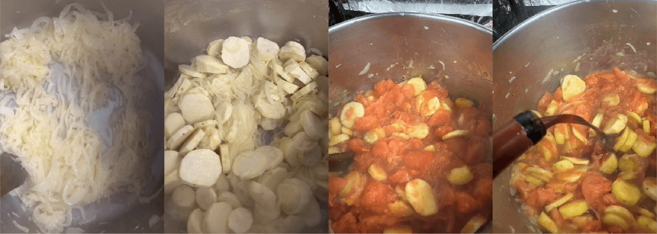 ① 野菜は水で良く洗い、土などをしっかりと落としておく。五郎島金時は皮をむいて1㎝幅にスライス、トマトはヘタを取って湯むきをし、ザク切りに、玉ネギは皮をむいて芯を取り、繊維を切る様にスライスする。