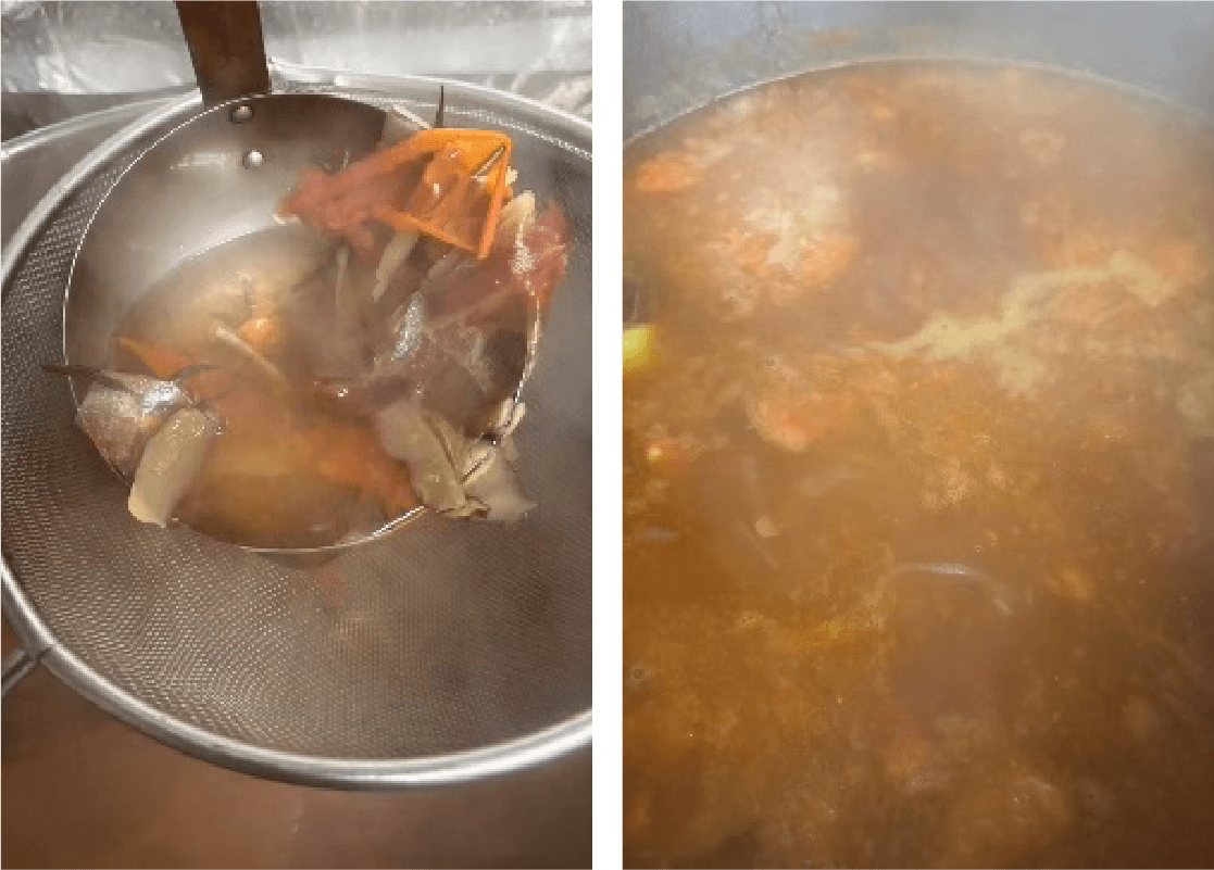 ② 鍋に水を張り、①で出た皮や芯、ヘタを入れて弱火で30分程煮出し、ダシを取る。