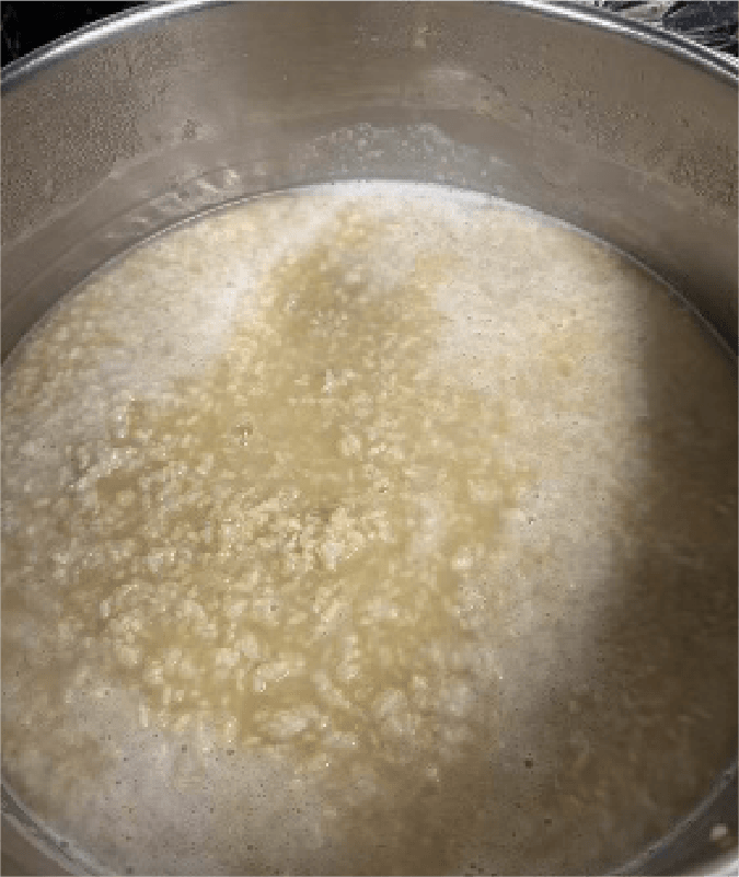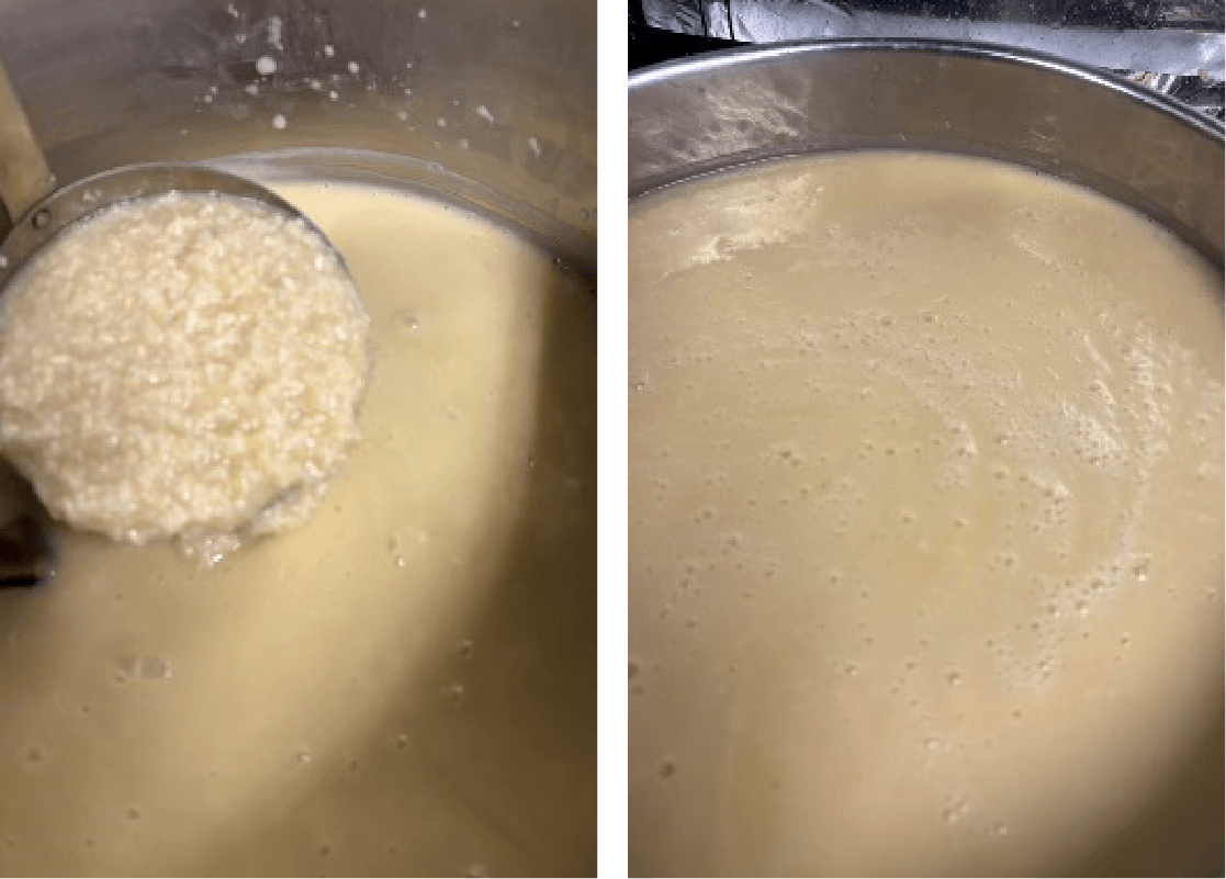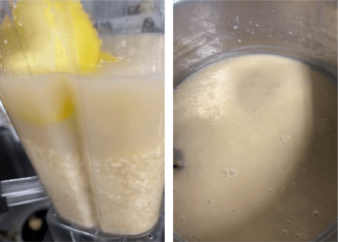 ④ ミキサーに①の米麹の2/3量、③のカットしたサツマイモに濃度を見て②の茹で汁を加えて攪拌し、鍋に入れる。粒の残っている米麹の残り1/3も鍋に入れ、混ぜ合わせる(飲んだ時に粒を程よく感じる様に)。