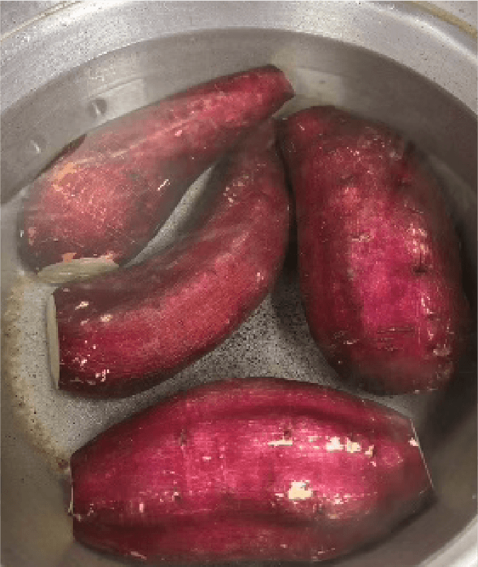 サツマイモを茹でます。