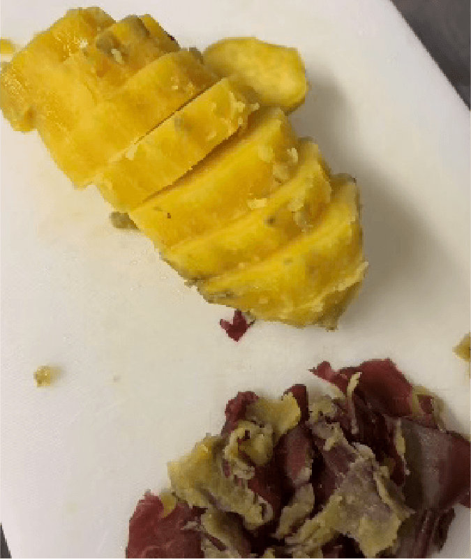 ③ サツマイモの皮をむき、2㎝位の幅にカットする。(むいた皮は砂糖醤油で炒めてきんぴらなどにご使用ください)