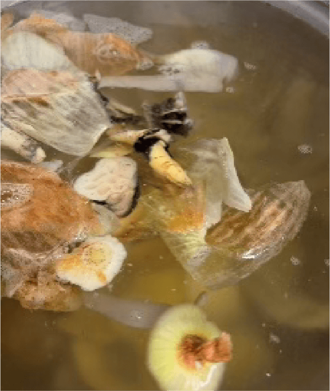 ② 鍋に水を張り①で出た皮や芯を入れて弱火で30分ほど煮出し、ダシを取る。