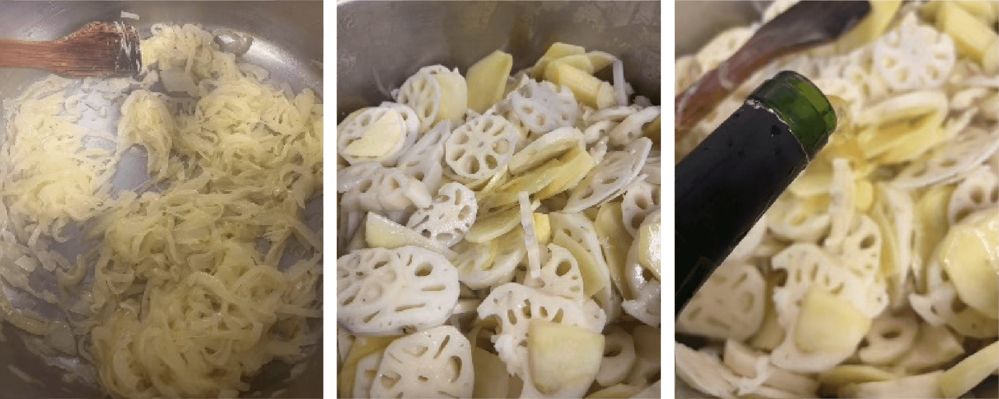 玉ネギを炒めたらレンコン、ジャガイモを加えて炒め、白ワインを加えて炒め馴染ませます。