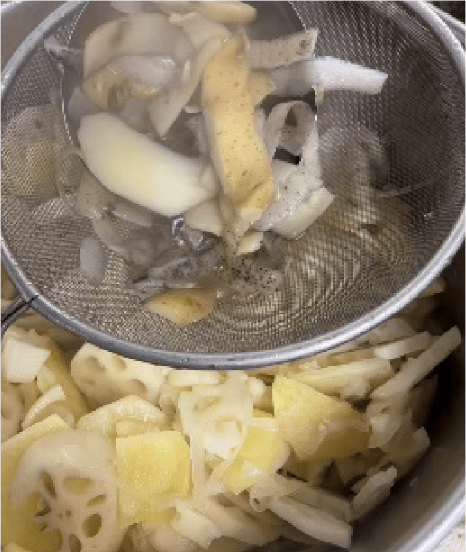 ① 野菜は水でよく洗っておく。レンコンは節で分けて皮をむき、1㎝幅にスライスしたら水にさらす。ジャガイモは皮をむいてスライス。玉ネギは皮をむいて芯を取り、繊維を切る様にスライスする。