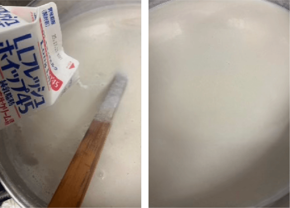 ⑤ ④をミキサーで回して鍋に戻して加熱し、灰汁を取る。牛乳、生クリームで伸ばして塩コショウ、砂糖で味を決め、最後に残りのバターを溶かして完成。