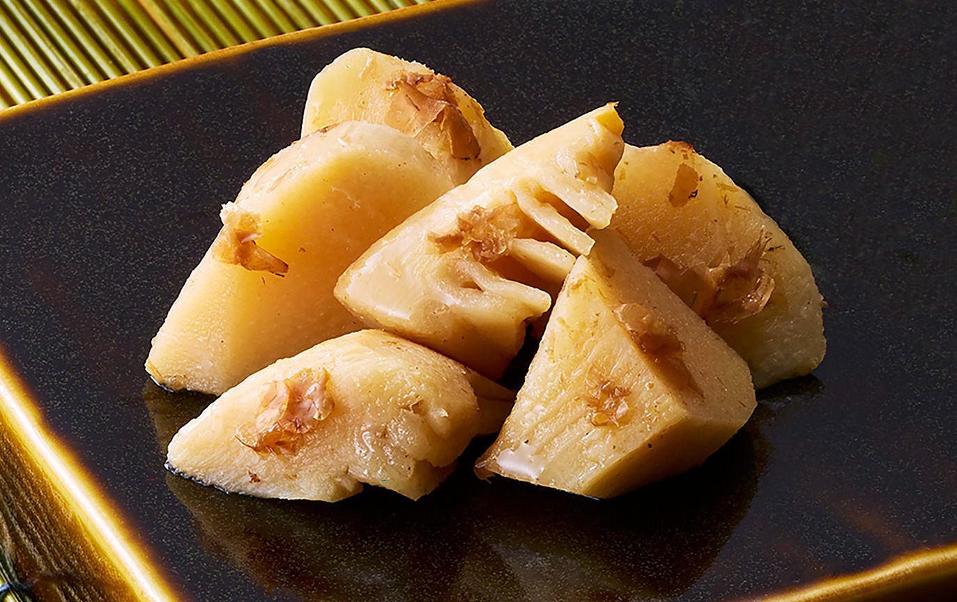 - 旬の時期に収穫したタケノコを、小さ目の乱切りにして、かつおだしで煮つけました。