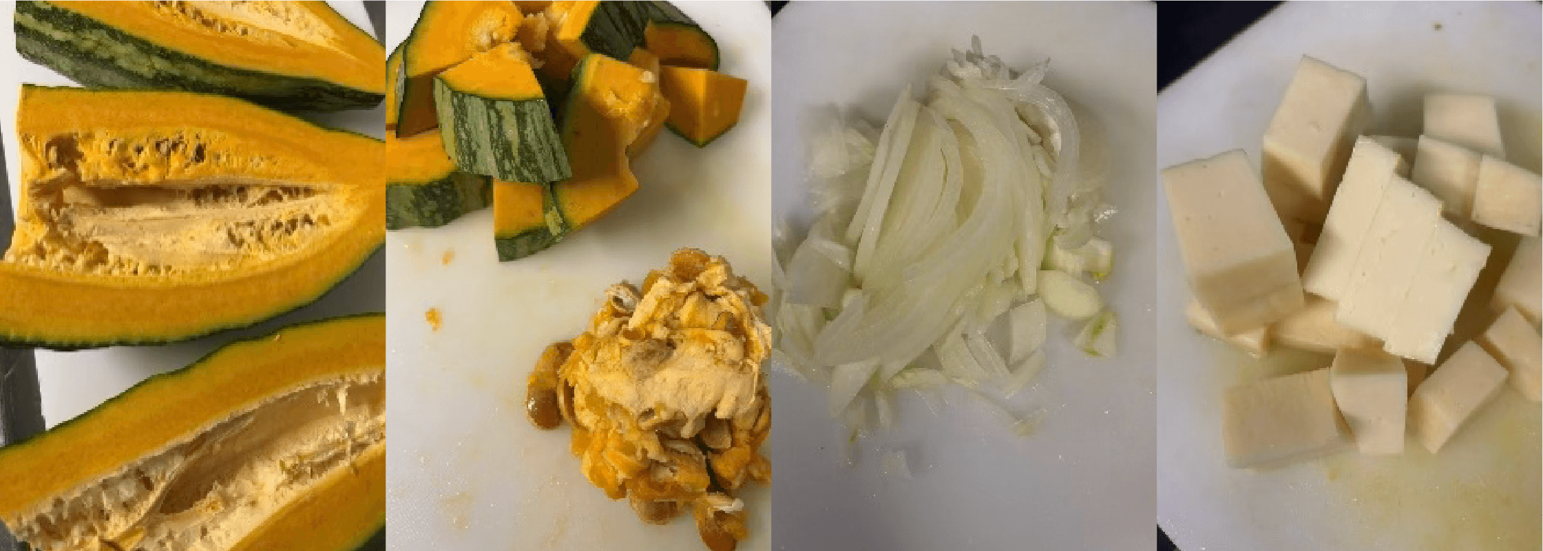 ① 野菜は水でよく洗っておく。長ちゃんかぼちゃは種と芯を取り、皮付きのまま一口大にカット、玉ネギは皮をむいて芯を取り、繊維を切る様にスライスする。