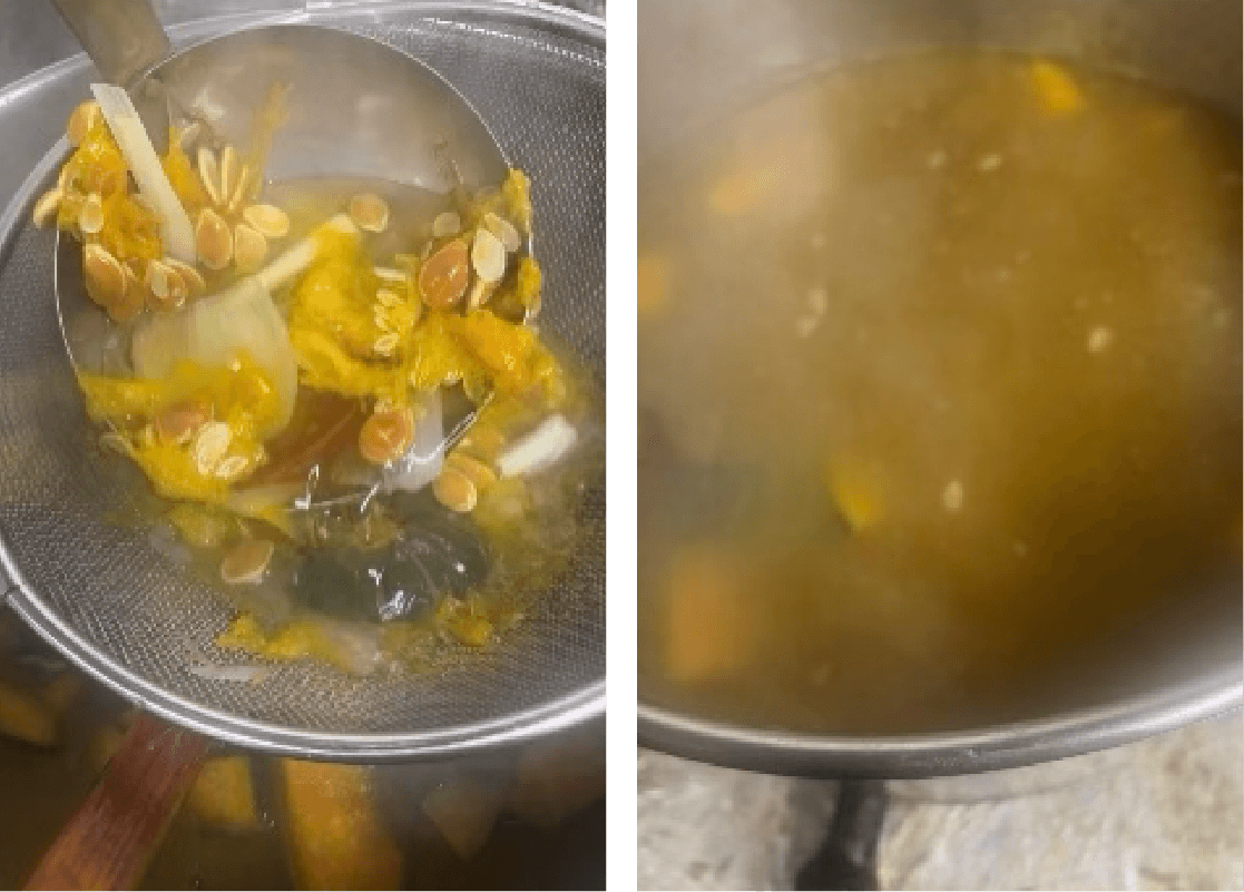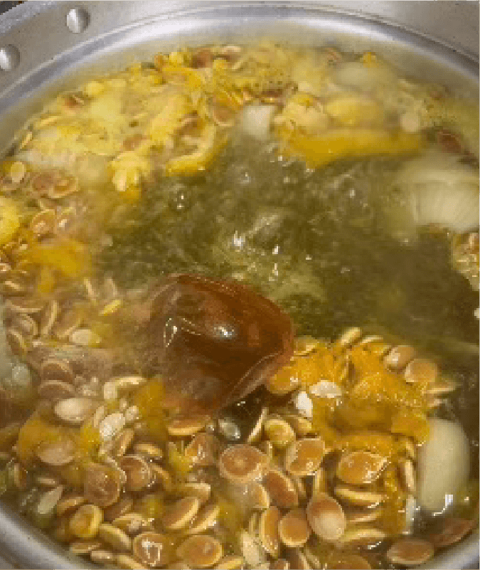 ② 鍋に水を張り①で出たかぼちゃの種とワタ、玉ネギの皮と芯を入れて弱火で煮出し、ダシを取る。