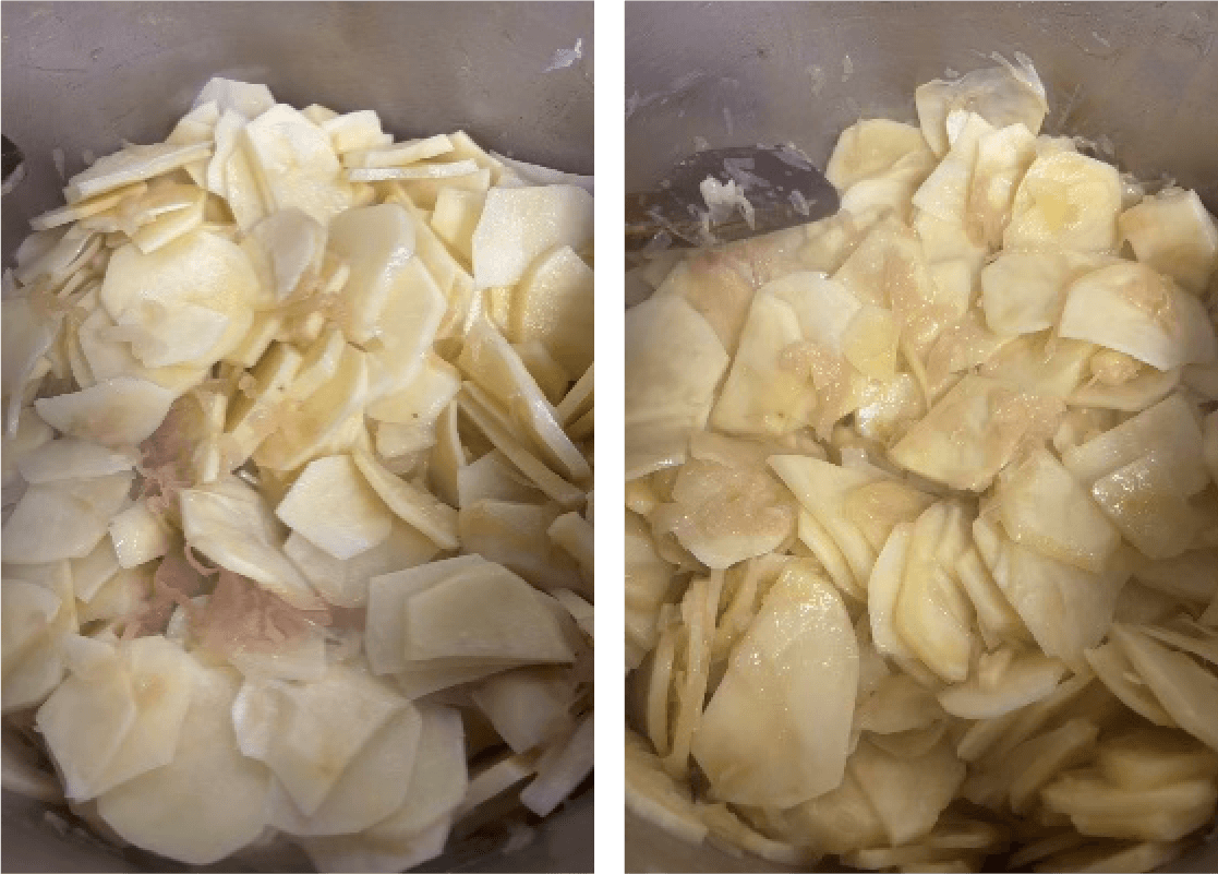 ⑤ ジャガイモを加えて混ぜ炒め、②の野菜ダシを濾して加えて10分程煮込む