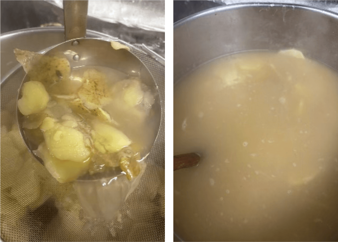 ② 鍋に水を張り、①の皮と芯を入れて弱火で30分ほど煮出し、ダシを取る。