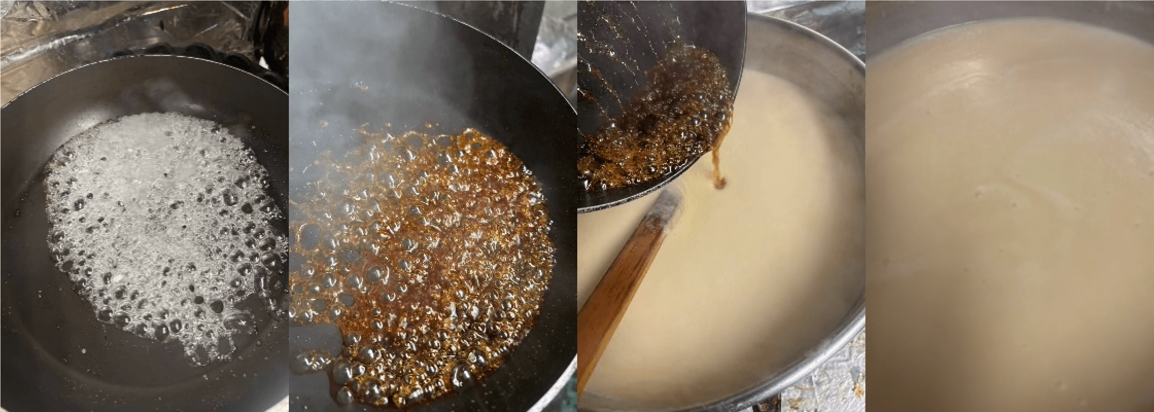 ⑧ フライパンに砂糖を入れて強火で加熱し、茶色くなったら水を少々加え、スープへ加える。最後に残りのバターを溶かして完成。
