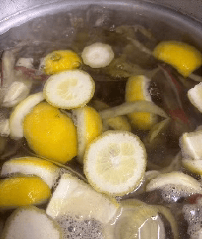 レモンの果肉を加えて混ぜ炒め、野菜ダシを濾して加えて煮込みます。
