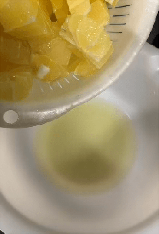 レモンに砂糖をまぶして、ザルで果肉と水分で分けます。