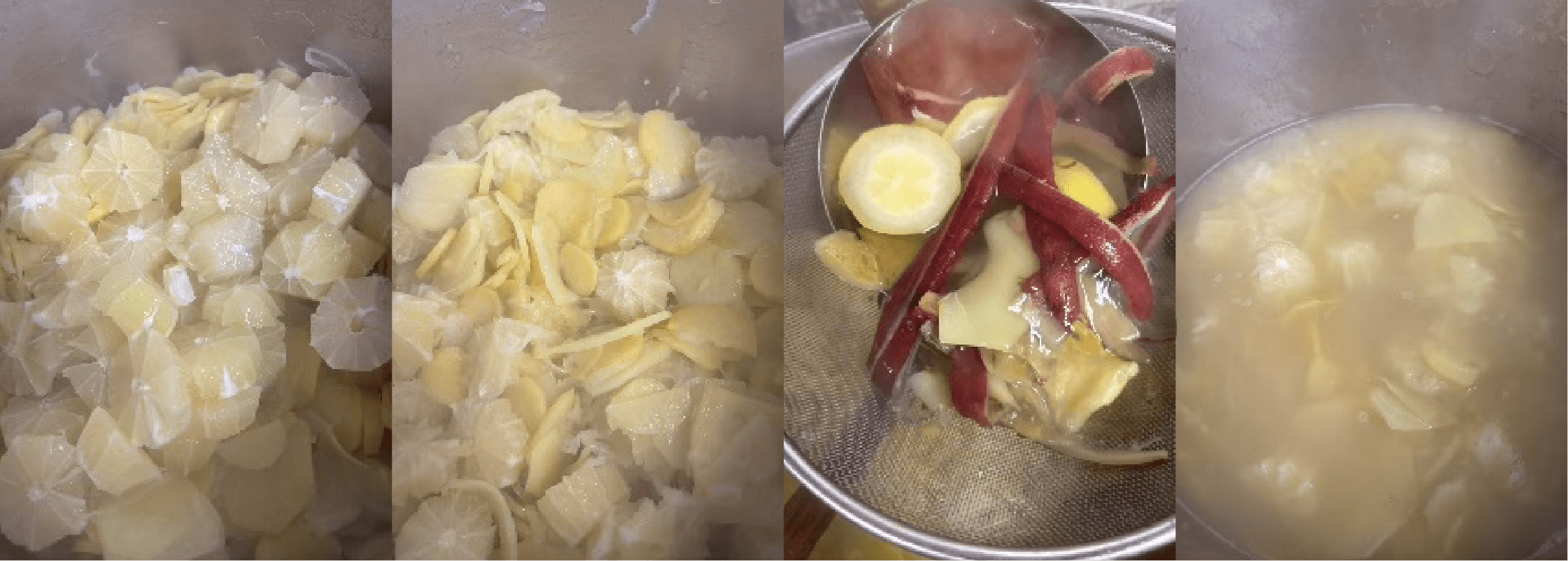 ④ ジャガイモ、サツマイモが透き通って来て、レモンから出た水分と糖分が全体に絡まった状態になったら、カットしたレモンの果肉を加えて軽く炒め、②の野菜ダシを濾して加えて煮込む。
