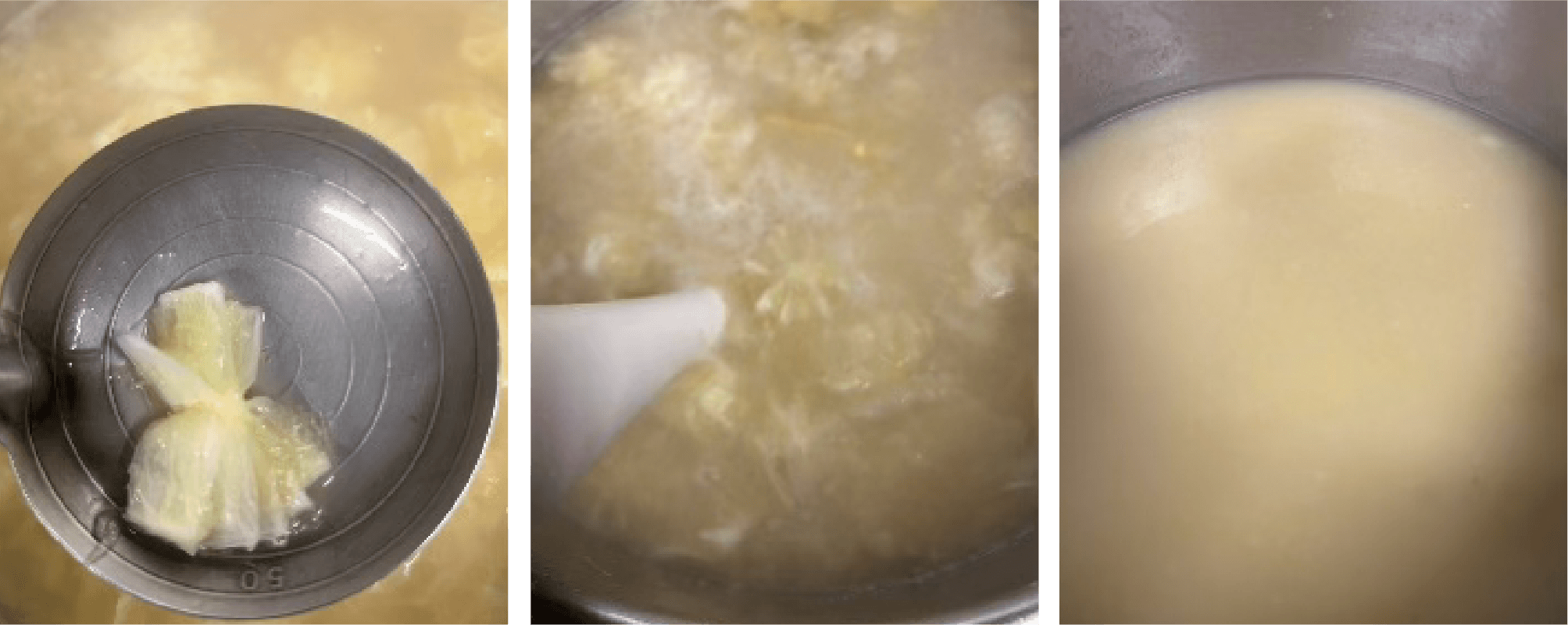 ② 鍋に水を張り、①の皮や芯を入れて弱部で30分ほど煮出し、ダシを取る。