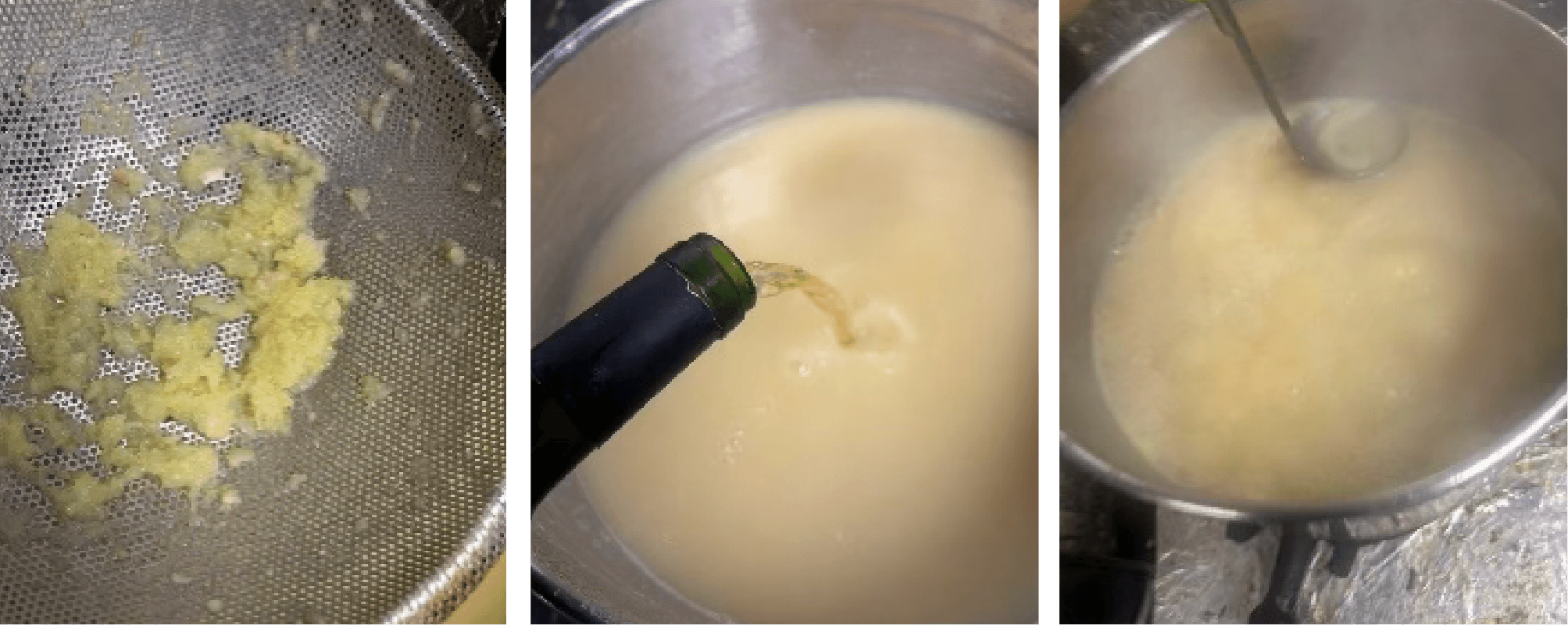 ザルで濾して白ワインを加え、加熱して灰汁を取ります。