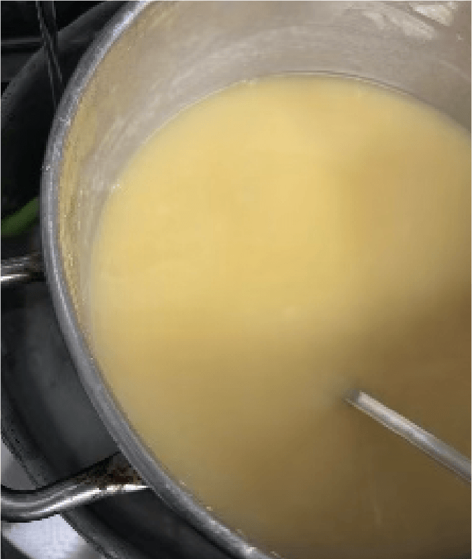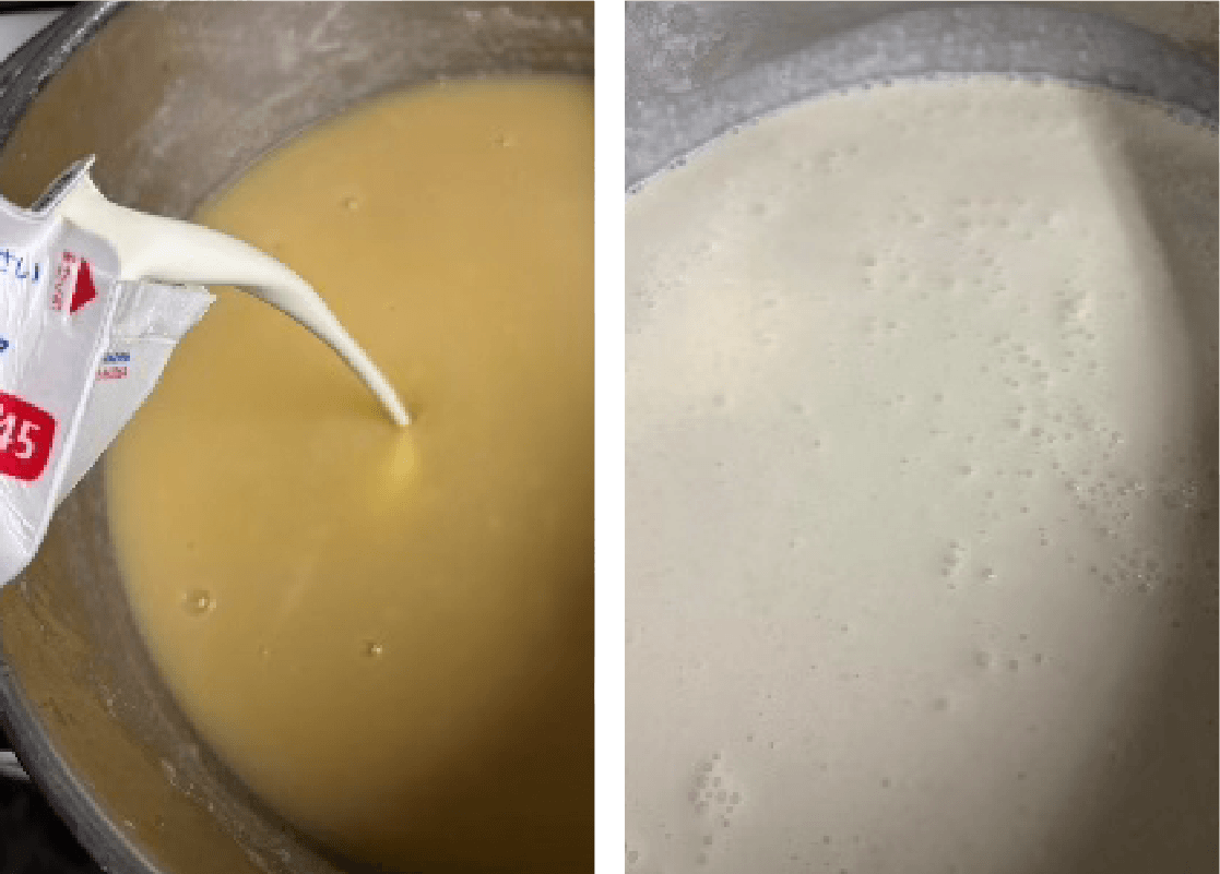 牛乳、生クリーム、レモン汁を加え、味を調えて完成です。