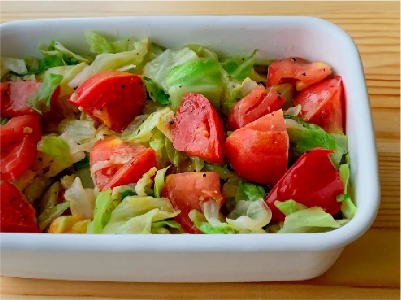 1. キャベツはひと口大(3~4cm角目安)のざく切りにし、大きめのボウルか鍋に入れ、塩をふりかけ、もみ込むようにして、塩をキャベツ全体に行き渡らせる。このまま10分程置く。