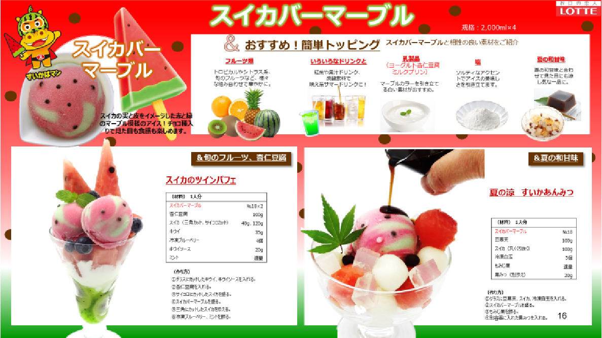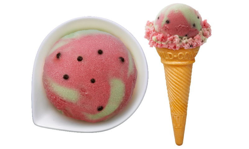 人気の市販用アイス「スイカバー」の味わいを忠実に再現しつつも、ディッシュアップしやすいなめらかさが特長のシャーベットです。