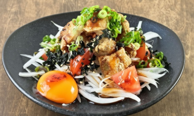 鶏皮揚げとオニスラのピリ辛サラダ