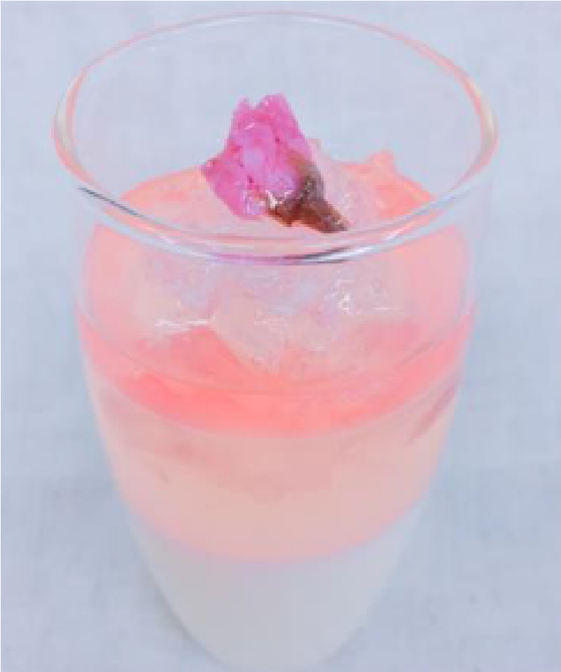 杏仁豆腐に上に桜舞うジュレ、キラキラクラッシュを適量絞り、
