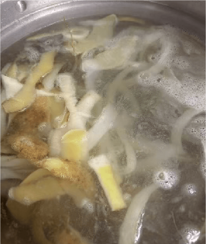 ② 鍋に水を張り、①で出た皮や芯、ヘタを入れて弱火で30分程煮出し、ダシを取る。