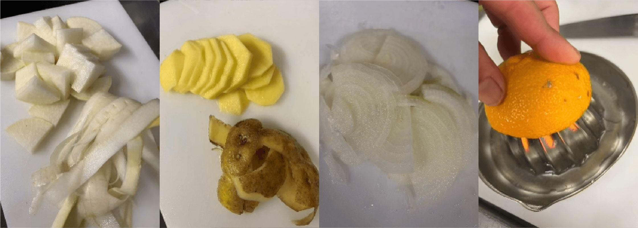 ① 野菜は水で良く洗い、土などをしっかりと落としておく。大根は葉を切り落として皮をむき、一口大にカット、ジャガイモは皮をむいて1㎝幅にスライス、玉ネギは皮とむいて芯を取り、繊維を切る様にスライス、ゆずは果汁を絞る(後で皮をすりおろすので、そのまま取っておく)。