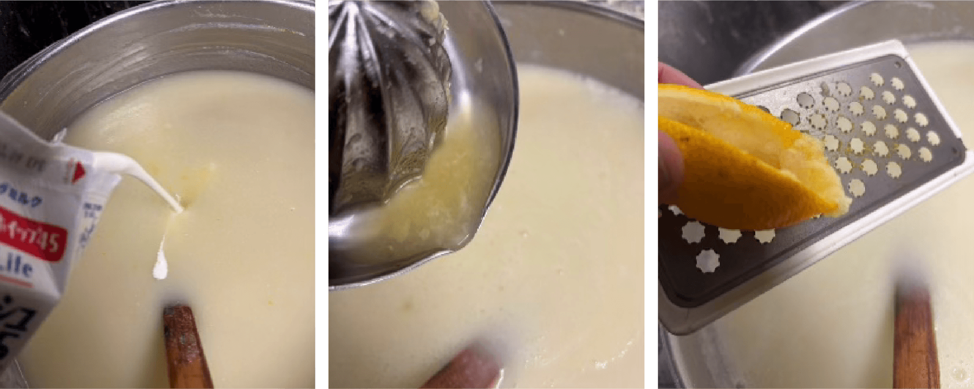 ⑥ 生クリームで伸ばして塩コショウ、砂糖で味を調え、ゆず果汁、ゆずの皮のすりおろしを加えて混ぜ合わせる。最後に残りのバターを溶かして完成。