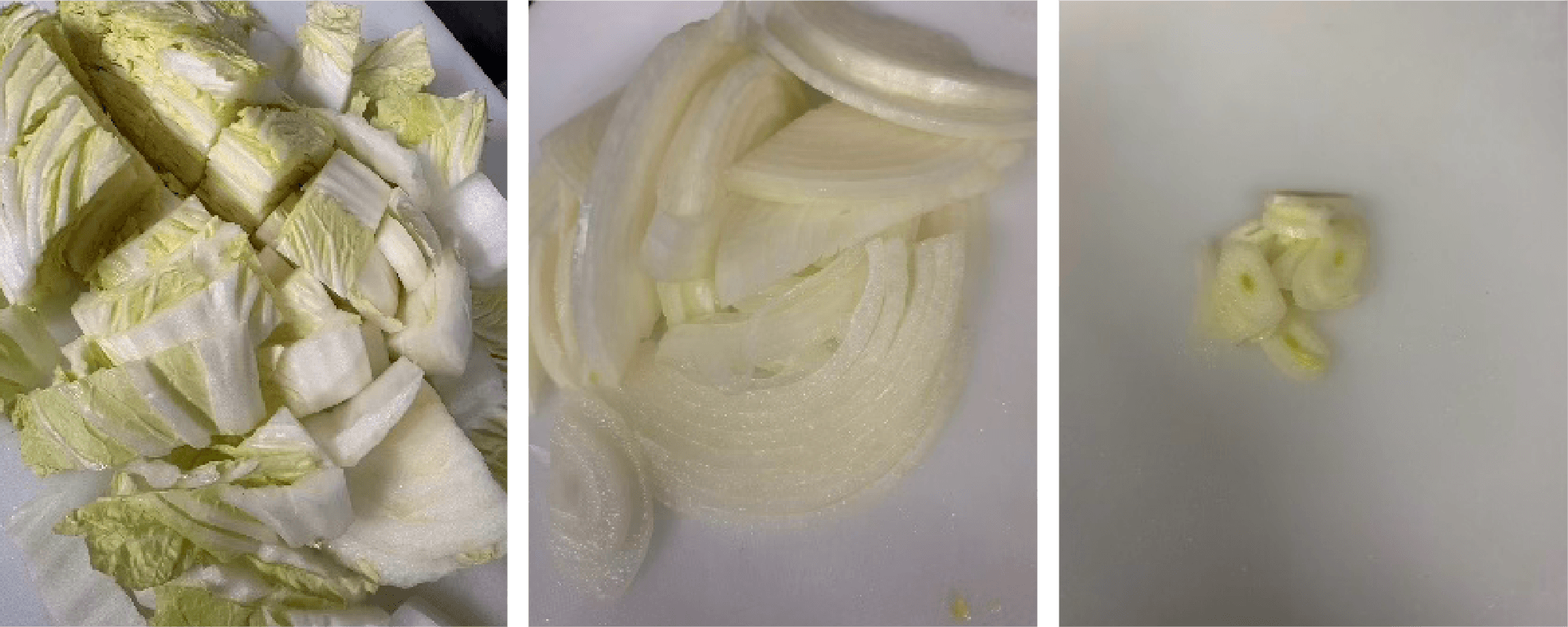 ① 野菜は水で良く洗っておく。わわ菜は一口大の大きさに芯ごとカット、玉ネギは繊維を切る様にスライス、ニンニクはスライスする。