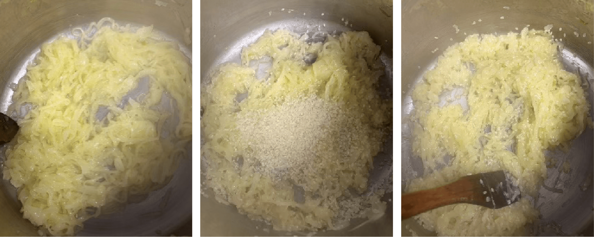 ② 別鍋に半分量のバター、玉ネギ、ニンニクを入れて弱火でじっくり炒め、甘さが出て来たら砂糖、お米を加えて軽く透き通るくらいまで炒める。