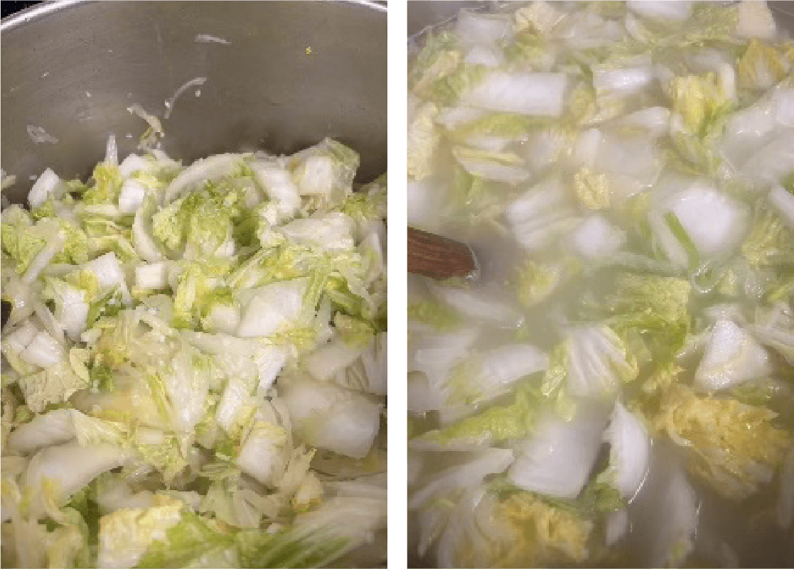 わわ菜を混ぜ炒めて水を加え、煮込みます。