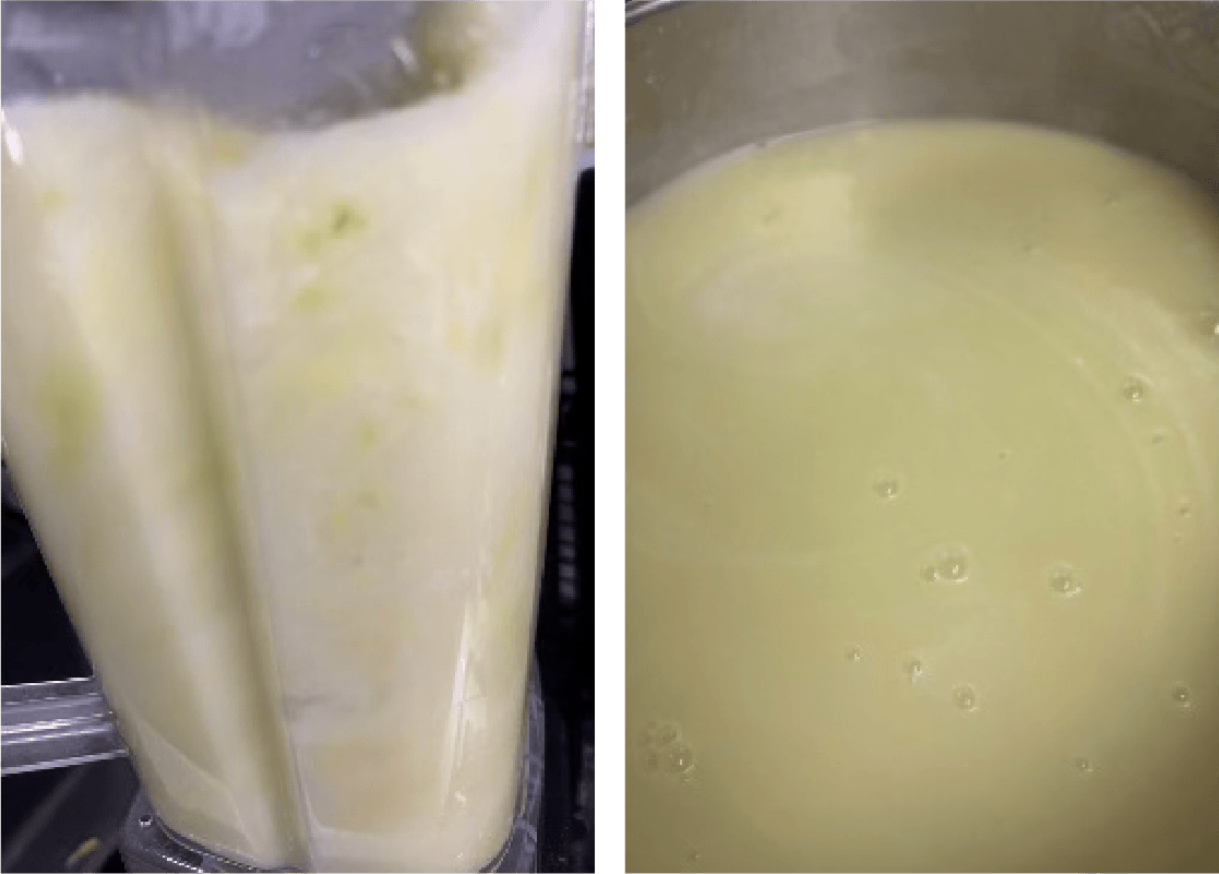 ④ わわ菜の芯まで柔らかくなったら火を止めてミキサーで回し、鍋に戻して再度加熱して灰汁を取る。