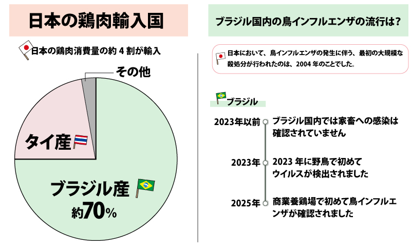 これまでブラジル国内では家畜への感染は確認されていませんでしたが、2023年に野鳥で検出されて以降、2025年5月にはついに「商業用養鶏場」での初めての感染が確認されました。これにより、日本を含む主要各国が対象地域からの輸入停止措置を講じています。