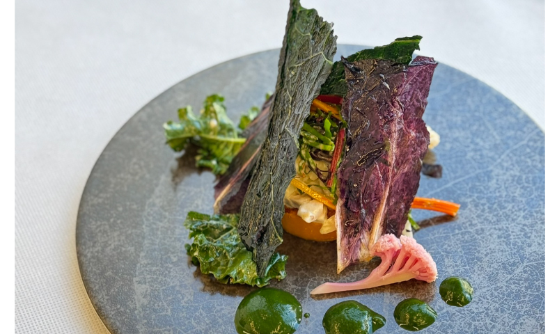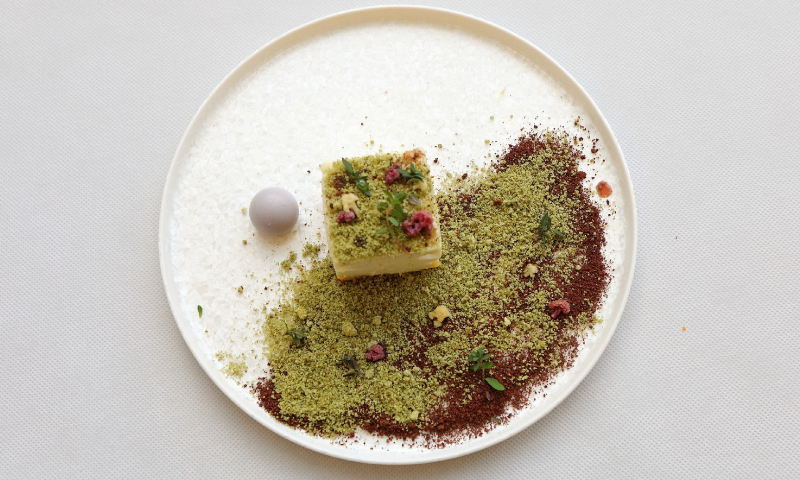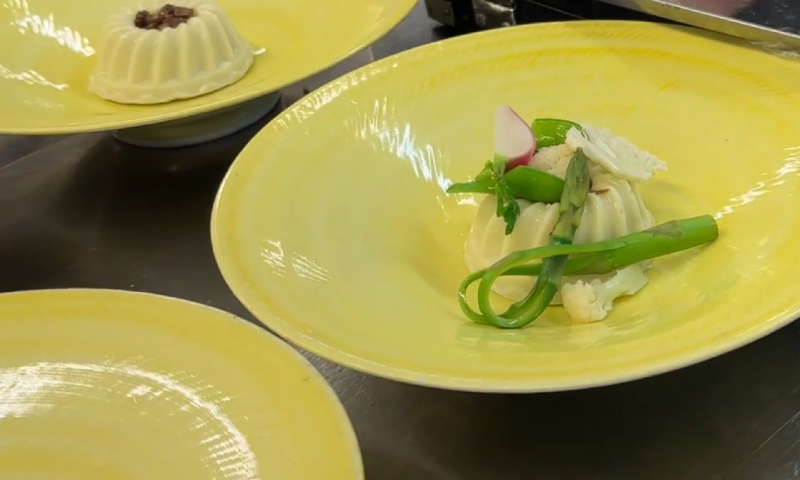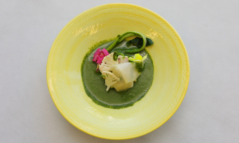 カリフラワーのババロアとコールラビのピクルス ~青野菜のスープ仕立て~